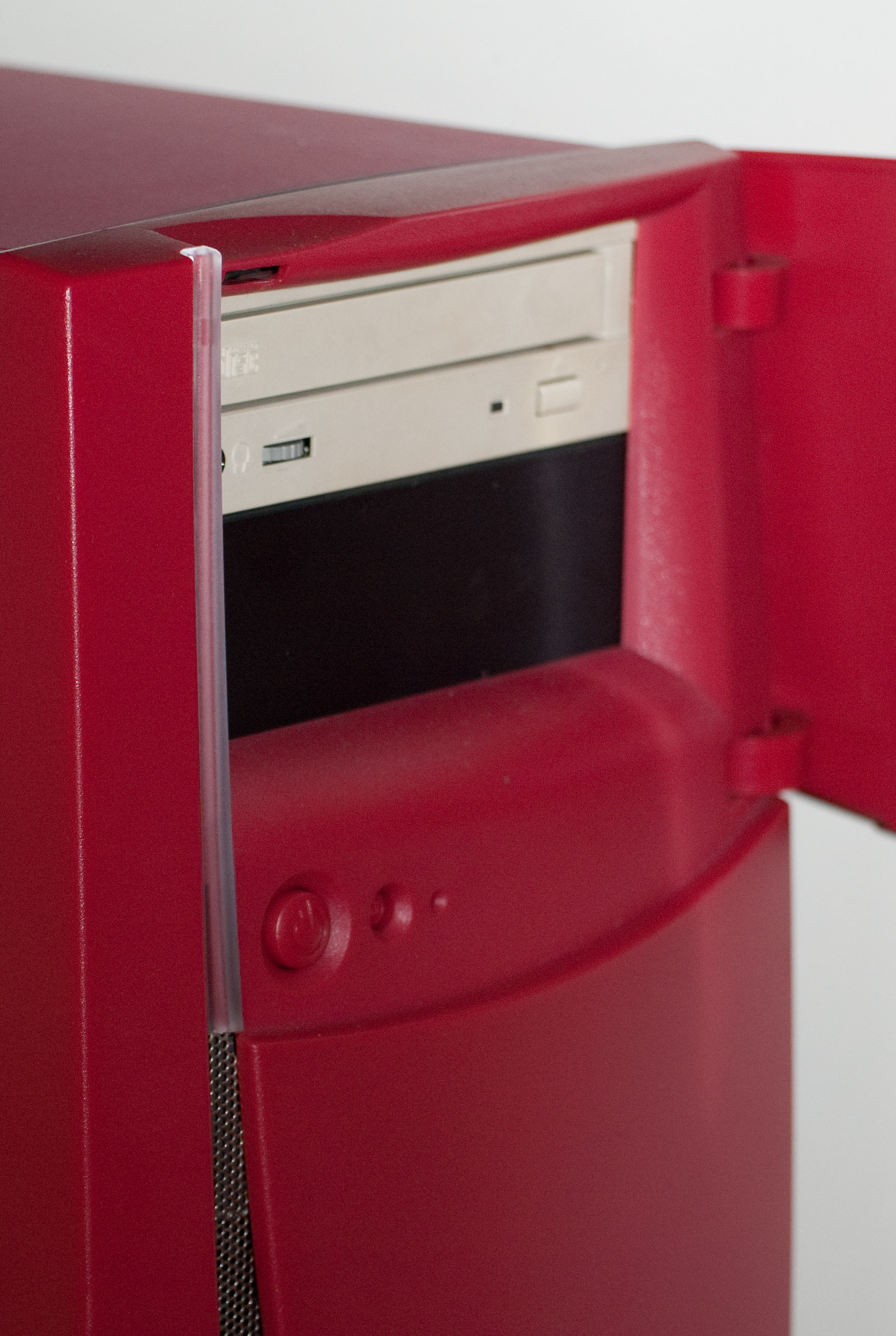 The chassis has a total of 5 storage bays for drives - 2 5.25" for DVD-ROMs and such, 3 3.5" for harddisks and other devices. The 5.25" bays can be accessed behind the door.