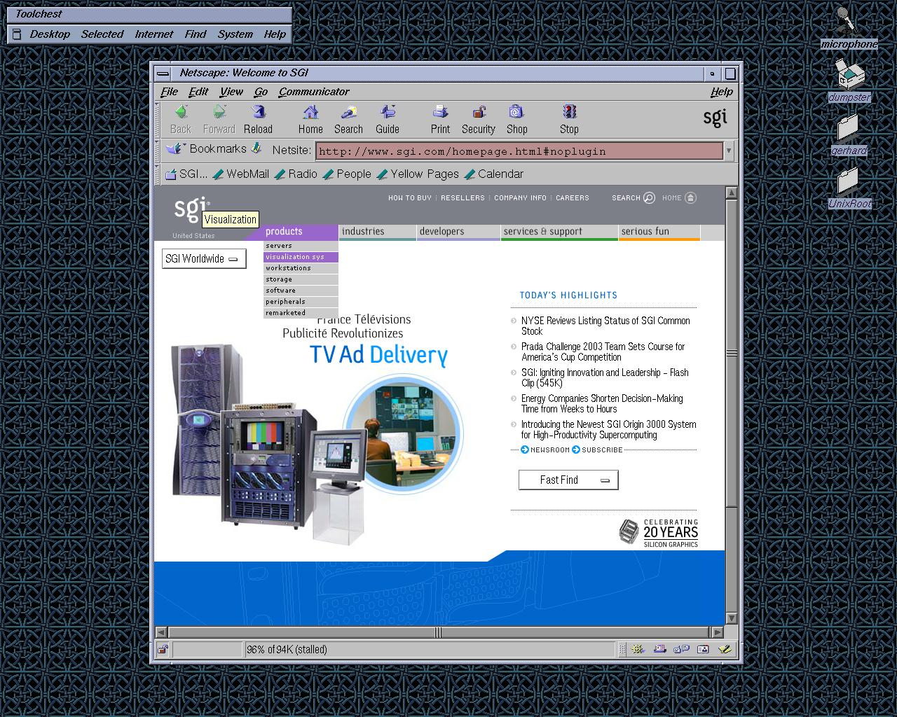 The following list starts with current systems and goes back to the early IRIS 4D days (for hardware information go to the systems page. In a similar fashion for all the listed systems the most recent operating system will be named, followed by exceptions that make it neccessary to choose an older version.